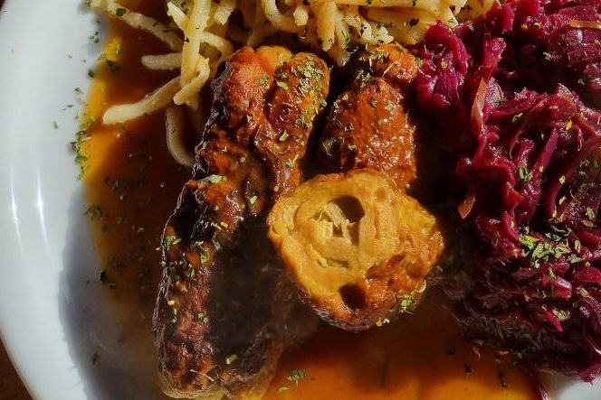 Unser Dinkel-Seitan in „saurer“ Soße ist eine herzhafte, vegane Spezialität, die geschmacklich an klassischen Sauerbraten erinnert. Die fein abgestimmte, leicht säuerliche Soße mit aromatischen Gewürzen macht ihn besonders vollmundig und perfekt für traditionelle Beilagen wie Spätzle, Kartoffeln oder Rotkraut.